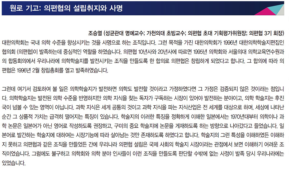 조승열 (성균관대 명예교수; 가천의대 초빙교수; 의편협 초대 기획평가위원장; 의편협 3기 회장) 대한의학회는 국내 의학 수준을 향상시키는 것을 사명으로 하는 조직입니다. 그런 목적을 가진 대한의학회가 1996년 대한의학학술지편집인협의회 (의편협)이 발족하는데 중심적인 역할을 하였습니다. 의편협 10년사와 20년사에 따르면 1995년 의학회와 서울의대 의학교육연수원과의 합동회의에서 우리나라에 의학학술지를 발전시키는 조직을 만들도록 한 합의로 의편협은 창립하게 되었다고 합니다. 그 합의에 따라 의편협은 1996년 2월 창립총회를 열고 발족하였습니다. 그런데 여기서 검토하여 볼 일은 의학학술지가 발전하면 의학도 발전할 것이라고 가정하였다면 그 가정은 검증되지 않은 것이라는 점입니다. 의학학술지는 발전된 의학 수준을 반영하지만 의학 지식을 찾는 독자가 구독하는 시장이 있어야 발전하는 분야이고, 의학 학술지는 후진국이 넘볼 수 있는 영역이 아닙니다. 과학 지식은 세계 공통의 것이고 과학 지식을 파는 지식산업은 전 세계를 대상으로 하며, 세상에 나타난 순간 그 상품적 가치는 급격히 떨어지는 특징이 있습니다. 학술지의 이러한 특징을 정확하게 이해한 일본에서는 1970년대부터 의학이나 과학 논문은 일본어가 아닌 영어로 작성하도록 권장하고, 구미의 중요 학술지에 논문을 게재하도록 하는 방향으로 나아갔다고 들었습니다. 일본어로 발간하는 학술지에 대하여는 시장기능에 따라 살아남는 것만 존재하도록 하였다고 합니다. 학술지의 그런 특성을 이해하였든 이해하지 못하고 의편협과 같은 조직을 만들었든 간에 우리나라 의편협 설립은 국제 사회의 학술지 시장이라는 관점에서 보면 이해하기 어려운 조직이었습니다. 그럼에도 불구하고 의학회와 의학 분야 인사들이 이런 조직을 만들도록 판단할 수밖에 없는 사정이 발족 당시 우리나라에는 있었습니다. 우리나라에서는 1958년 이후 의학 학술지를 계속 창간하여 1990년대에는 300여 종의 학술지가 발간되고 있었습니다. 문제는 독자의 대부분이 국내 의학 학술지를 과학적 의학 지식을 얻는 통로로 생각하지 않았다는 점입니다. 심지어 의학도서관도 우리나라 의학 학술지는 구독하지 않았습니다. 의학학술지를 발간하는 대학, 학회, 병원, 연구소 등은 학술지를 기관의 실적이라는 생각으로 발간하였지 독자를 위하여 읽히는 학술지를 발간한다는 생각은 약했습니다. 따라서 당시 우리나라 의학학술지는 모두 그렇지는 않았지만 정기간행물의 기본이 무엇인지, 편집인이 무엇을 하는 직책인지, 발행인은 학술지 발간을 어떻게 지원하여야 하는지 모르면서 발간하는 경우가 허다하였습니다. 학술지의 투고규정은 애매하거나 간략하였고, 편집의 일관성이나, 발행일자 준수 등을 지키지 못하는 경우가 많았습니다. 당시 학술지 상황은 많은 경우 열악하였지만 모두가 그런 것은 아니었고, 또 우리나라 의학 연구 수준이 아주 낮은 것도 아니었습니다. 창립 당시 우리나라에서는 의학 분야에서 중대한 변화가 동시 다발적으로 일어나고 있었습니다. SCI 등재학술지에 논문을 게재한 사람을 우대하고, 의학 연구비가 늘어나기 시작하였으며, 외국의 저명학술지에 논문을 게재한 경험이 있는 젊은 연구자 수가 늘어나 외국 학술지 편집인과 논문 게재와 관련된 경험이 축적되고 있었습니다. 이러한 상황에서 의편협은 발족하였으나, 재정적인 면에서 의편협은 영세하여 회원 학회 회비와 의학회 보조로 운영할 수밖에 없었습니다. 그러한 상황에서 의편협은 할 일과 할 수 있는 일, 할 수 없는 일을 명확히 정립하여 목표를 구체화 하여야 하였습니다. 물론 학술지 발행 보조금을 지급할 수 없었습니다. 그리고 학술지 발간은 개개 학술지 발행인의 권리와 의무라는 점을 명확히 인식하였습니다. 당시 의편협이 할 수 있는 첫 번째 일은 발행인과 편집인, 그리고 출판업에 종사하는 인원을 교육하는 일과 발간한 학술지를 평가하는 일이었습니다. 의학학술지 편집 교육의 기준은 국제의학학술지편집인위원회 (ICMJE)가 발표한 “생의학학술지에 투고하는 원고의 통일 양식”이었고, 여기에는 학술지 투고규정, 발행 관행, 편집윤리 등의 내용이 포함되어 있었습니다. 각 학술지의 편집 수준을 국제적 수준으로 올렸다고 학술지가 높이 평가를 받는 것은 아니지만, 편집 수준은 좋은 평가를 받는 기초가 됩니다. 그런 점에서 의편협의 교육과 평가 사업은 중요하였습니다. 의편협의 설립 취지에 가장 걸맞는 사업은 단연 국제화한 의학정보 사업이었습니다. 학회 homepage 제작으로 시작한 이 사업은 KoreaMed로 이어졌는데, 초기 KoreaMed 사업은 의학학술지를 구독하지 않는 우리나라의 특성 때문에 고난을 겪었습니다만 의편협이 자체적으로 PubMed와 같은 형식으로 만들어 크게 성공하였습니다. 이어서 우리나라 정보통신 산업 발전에 발맞추어 KoMCI, Synapse 등 데이터베이스로 발전하여 NLM, CrossRef 등 국제적 의학 정보 관계자를 놀라게 하였습니다. MeSH 반자동 생성기능을 만들어 독자가 효과적으로 정보에 접근하게 하였습니다. 기타 의편협이 