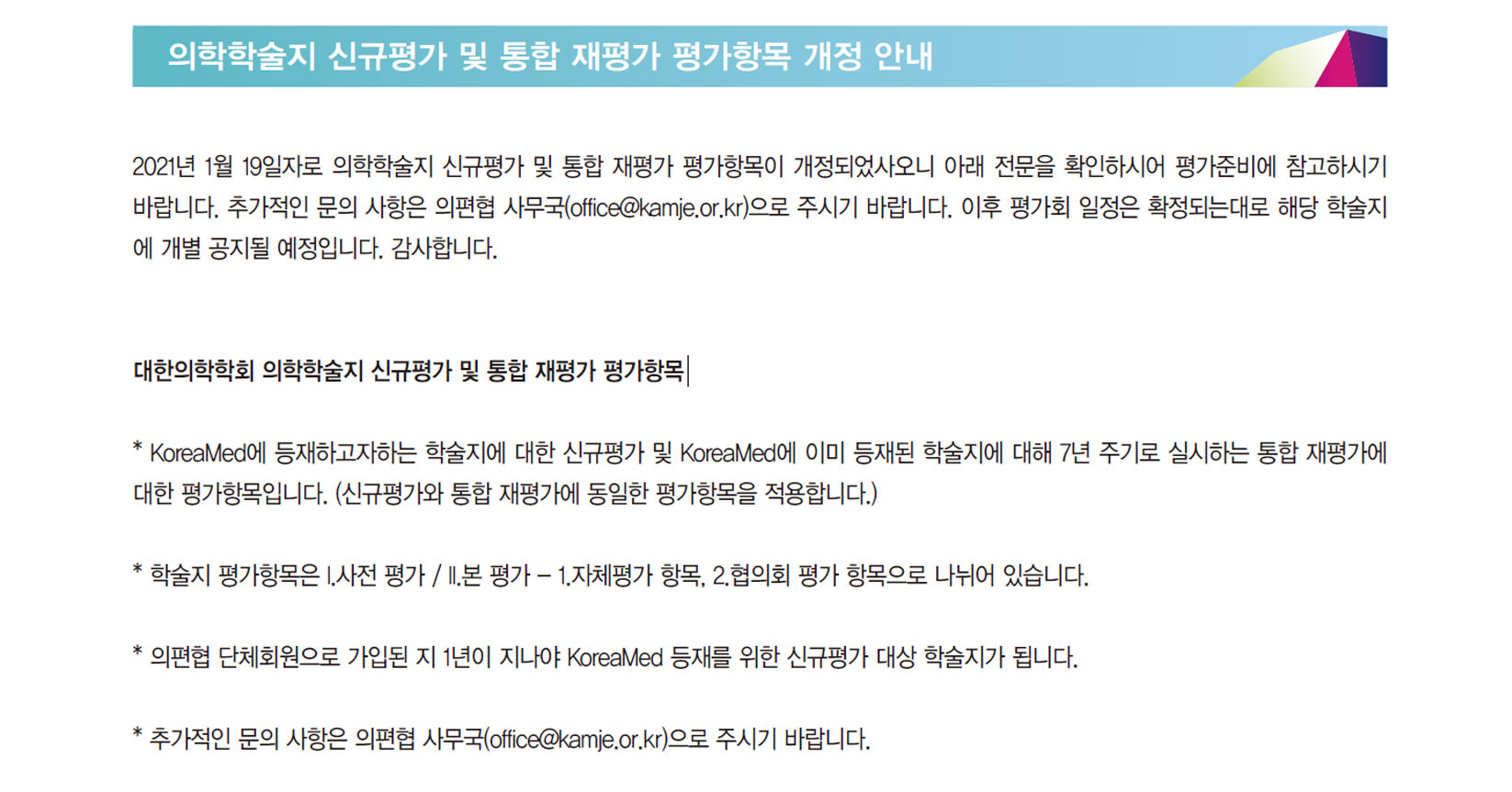 2021년 1월 19일자로 의학학술지 신규평가 및 통합 재평가 평가항목이 개정되었사오니 아래 전문을 확인하시어 평가준비에 참고하시기 바랍니다. 추가적인 문의 사항은 의편협 사무국(office@kamje.or.kr)으로 주시기 바랍니다. 이후 평가회 일정은 확정되는대로 해당 학술지에 개별 공지될 예정입니다. 감사합니다. 대한의학학회 의학학술지 신규평가 및 통합 재평가 평가항목 * KoreaMed에 등재하고자하는 학술지에 대한 신규평가 및 KoreaMed에 이미 등재된 학술지에 대해 7년 주기로 실시하는 통합 재평가에 대한 평가항목입니다. (신규평가와 통합 재평가에 동일한 평가항목을 적용합니다.) * 학술지 평가항목은 I.사전 평가 / II.본 평가 - 1.자체평가 항목, 2.협의회 평가 항목 으로 나뉘어 있습니다. * 의편협 단체회원으로 가입된 지 1년이 지나야 KoreaMed 등재를 위한 신규평가 대상 학술지가 됩니다. * 추가적인 문의 사항은 의편협 사무국(office@kamje.or.kr)으로 주시기 바랍니다. 상세내용 확인하기