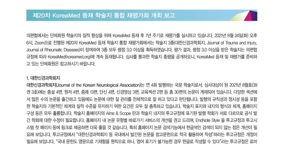 의편협에서는 단체회원 학술지의 질적 향상을 위해 KoreaMed 등재 후 7년 주기로 재평가를 실시하고 있습니다. 2021년 8월 24일(화) 오후 6시, Zoom으로 진행된 제20차 KoreaMed 등재 학술지 통합 재평가회에서는 학술지 3종(대한신경과학회지, Journal of Trauma and Injury, Journal of Rheumatic Diseases)이 참여하여 3종 모두 평점 3.0 이상을 획득하였습니다. 평가 결과, 평점 3.0 이상을 받은 학술지는 의편협 규정에 따라 KoreaMed(koreamed.org)에 계속 등재됩니다. 심사를 통과한 학술지 총평을 공개하오니, KoreaMed 등재 및 재평가를 준비하고 있는 단체회원은 참고하시기 바랍니다. 1. 대한신경과학회지 대한신경과학회지(Journal of the Korean Neurological Association)는 연 4회 발행하는 국문 학술지로서, 심사대상이 된 2021년 8월호(39권 3호)에는 종설 4편, 원저 4편, 증례 13편, 단신 4편, 신경영상 3편, 교육섹션 2편 등 총 30편의 논문이 게재되어 있습니다. 다양한 섹션에서 많은 수의 논문을 출간하고 있음에도 논문에 대한 질 관리를 전체적으로 잘 하고 있다고 판단됩니다. 발행의 규칙성과 정시성 등을 포함한 학술지의 기본적인 체계와 질적 수준을 유지하기 위한 요건은 모두 잘 충족하고 있습니다. 학술지 표지와 내지의 형식과 체계, 홈페이지 구성 등은 모두 훌륭합니다. 학술지 홈페이지의 Aims & Scope 란과 학술지 내지의 투고규정에 표기된 발행 학회가 서로 다르므로 공식 발간 학회에 대한 수정이 필요합니다. 홈페이지 내 논문 유형별 바로가기 서비스의 개선을 권고 드리며, EndNote Style 을 투고규정과 투고시스템 첫 페이지 등에 링크로 제공하면 더욱 좋을 것 같습니다. 특히 홈페이지 논문 검색기능에서 한글색인 검색이 되지 않는 점은 개선이 필요해 보입니다. 투고규정에서 “대한신경과학회지 등 국내에서 발간된 논문을 참고문헌으로 적극 활용하여 작성”하라는 투고규정은 개정이 필요해 보입니다. “국내 문헌도 영문으로 기재함을 원칙으로 하나, 영어 표기가 불가능한 경우 한글로 작성할 수 있다”라는 투고규정은 로마자 표기를 하더라도 반드시 영문으로 기재하도록 수정하는 것이 바람직합니다. 온라인 투고 시스템을 갖추고 있고, 저자 동의서를 스캔해서 온라인으로 제출하게 하는데, 투고규정에는 팩스로 전송하도록 한 부분은 수정이 필요합니다. 논문의 부제목 표기법의 통일이 필요하고, 일부 논문 제목에서 단어의 오타가 관찰됩니다. 논문의 첫페이지(표제면)에 저작권 표시가 없으므로 표기를 권고합니다. 저자가 원문을 확인하지 않고 인용한 것으로 보이는 참고문헌과 Proceeding 자료가 여러 건 보입니다. 인용확인이 되지 않는 경우에 독자가 그 문헌을 찾아볼 수 없기 때문에 편집인이 자체적으로 검색하고 체크한 후 다른 정식 출간 문헌으로 변경이 가능한지를 저자에게 질의하고 요구할 필요가 있겠습니다. 참고문헌 수 규정을 위반한 단신이 1편 있습니다. 온전히 한글로만 작성된 표와 그림, 영어로 작성된 그림 안에 한글 제목이 기입된 그림, 그리고 Figure legend에 그림에 사용되지 않은 약어의 설명이 있는 그림이 여럿 있습니다. 모든 표와 그림은 영어로 작성하는 것을 권고합니다. 국문 논문이어도 표와 그림은 영문으로 기재해야 해외 데이터베이스에서 검색할 때 볼 수 있으므로 영문으로 기재하는 것이 바람직합니다. 동시에 투고규정에도 영문으로 작성하도록 명시하는 것이 좋겠습니다. 환자의 영상이 많은 학술지이므로 환자의 동의 여부를 표기하기를 권고합니다. 오랜 역사를 갖고 있는 학술지로서 일부 미비한 점이 있으나, 비교적 잘 관리되고 있는 것으로 보입니다. 대한신경과학회에서는 SCI 등재 학술지인 영문 학술지와 국문 학술지를 함께 발간하고 있는데, 우리나라 의학학술지 발간 환경에서 국문 학술지의 역할이 있으므로 앞으로 잘 유지 발전시켜 국문 학술지의 모델이 되기를 기대합니다. 2. Journal of Trauma and Injury Journal of Trauma and Injury (JTI)는 The Korean Society of Traumatology가 연 4회 발간하는 영문 학술지로서, 심사대상이 된 2021년 6월호(34권 2호)에는 Editorial 1편, 원저 6편, 증례 4편 등 총 11편의 논문이 게재되어 있습니다. 전체적으로 인쇄자료와 홈페이지 모두 잘 만들어진 좋은 학술지라 생각합니다. 해외 데이터베이스에 등재되지 않았지만 Web of Science 에 많이 인용되고 있습니다. 학술지의 기본 번호인 ISSN이 올바른지에 대한 확인이 필요합니다. 영문학술지로 제호를 변경하면 원칙적으로는 pISSN을 새로 받아야 하는데 그런 기록이 없고, 온라인 학술지에 대한 eISSN을 새로 받은 것으로 보이는데 정확한 이력관리가 필요합니다. 학술지 표지에 홈페이지의 URL이 없으므로 추가하기를 권합니다. 판권란의 구독(subscription)정보란에 투고정보가 잘못 기술되어 있으므로 수정이 필요합니다. 발행인으로서 학회 대표자 표기보다는 학회명을 사용할 것을 추천합니다. 국제학술지를 표방하고 있으므로 국내외 편집위원을 구분하지 말고 모든 편집위원 명단을 알파벳으로 배열하면 좋겠습니다. 투고규정에 자세히 많은 내용을 기술하고자 하는 노력으로 인해 비슷한 내용이 여기 저기 흩어져 있어 내용이 다