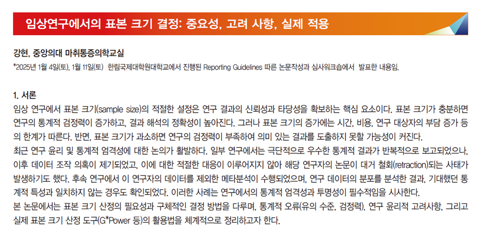 강현, 중앙의대 마취통증의학교실 *2025년 1월 4일(토), 1월 11일(토) 한림국제대학원대학교에서 진행된 Reporting Guidelines 따른 논문작성과 심사워크숍에서 발표한 내용임. 1. 서론 임상 연구에서 표본 크기(sample size)의 적절한 설정은 연구 결과의 신뢰성과 타당성을 확보하는 핵심 요소이다. 표본 크기가 충분하면 연구의 통계적 검정력이 증가하고, 결과 해석의 정확성이 높아진다. 그러나 표본 크기의 증가에는 시간, 비용, 연구 대상자의 부담 증가 등의 한계가 따른다. 반면, 표본 크기가 과소하면 연구의 검정력이 부족하여 의미 있는 결과를 도출하지 못할 가능성이 커진다. 최근 연구 윤리 및 통계적 엄격성에 대한 논의가 활발하다. 일부 연구에서는 극단적으로 우수한 통계적 결과가 반복적으로 보고되었으나, 이후 데이터 조작 의혹이 제기되었고, 이에 대한 적절한 대응이 이루어지지 않아 해당 연구자의 논문이 대거 철회(retraction)되는 사태가 발생하기도 했다. 후속 연구에서 이 연구자의 데이터를 제외한 메타분석이 수행되었으며, 연구 데이터의 분포를 분석한 결과, 기대했던 통계적 특성과 일치하지 않는 경우도 확인되었다. 이러한 사례는 연구에서의 통계적 엄격성과 투명성이 필수적임을 시사한다. 본 논문에서는 표본 크기 산정의 필요성과 구체적인 결정 방법을 다루며, 통계적 오류(유의 수준, 검정력), 연구 윤리적 고려사항, 그리고 실제 표본 크기 산정 도구(G*Power 등)의 활용법을 체계적으로 정리하고자 한다. 2. 표본 크기 결정의 중요성 (1) 과학적 측면 임상 연구의 핵심 목표는 치료 효과를 정확하게 추정하는 것이다. 연구 설계에서 표본 크기가 적절하지 않으면, 연구 결과가 신뢰성을 확보하지 못해 근거 기반 의학적 판단이 어려워진다. 표본 크기가 너무 작을 경우: 효과가 크게 나타나더라도 표본 변동성에 의한 우연한 결과일 가능성을 배제할 수 없다. 표본 크기가 너무 클 경우: 연구자가 주요 평가 변수뿐만 아니라, 부차적인 변수에서도 통계적으로 유의한 차이를 발견하게 되어, 실제 중요한 효과가 무엇인지 판단하기 어려워질 수 있다. (2) 경제적 측면 표본 크기의 결정은 연구 자원의 효율적 사용과 직결된다. 표본 크기가 과대할 경우: 불필요한 시간, 비용, 인력 소모가 증가하여 자원의 비효율적 낭비를 초래한다. 표본 크기가 부족할 경우: 검정력이 부족하여 의미 있는 결론을 도출하지 못하고 연구 자체가 무의미해질 수 있으며, 연구에 투입된 비용과 노력이 낭비될 가능성이 크다. (3) 윤리적 측면 연구 대상자의 안전과 연구 윤리는 표본 크기 결정 과정에서 반드시 고려되어야 한다. 표본 크기가 과도할 경우: 연구 대상자가 불필요한 치료, 위험, 불편을 감수해야 할 수도 있다. 표본 크기가 부족할 경우: 연구 질문에 대한 명확한 답을 제공하지 못하여, 연구 대상자의 희생이 의미 없는 것이 될 수 있다. 또한, 효과가 있는 치료법이 충분히 검증되지 못한 채 기각될 가능성이 있으며, 이는 의료 발전에 부정적 영향을 미칠 수 있다. 3. 표본 크기 산정 오류의 유형 표본 크기 산정이 부적절하게 수행될 경우, 연구의 신뢰성이 훼손될 수 있다. 대표적인 오류 유형은 다음과 같다. 임의로 연구 대상 수를 결정하는 경우: 과학적 근거 없이 표본 크기를 설정하면 연구 결과의 신뢰성이 보장되지 않는다. 표본 크기 계산에 필요한 요인을 고려하지 않는 경우: 유의 수준(α), 검정력(1-β), 효과 크기(effect size) 등의 변수를 포함하지 않으면 표본 크기가 부적절해질 수 있다. 계산에 필요한 요인을 명시했지만, 근거를 제시하지 않는 경우: 기존 문헌이나 파일럿 연구 없이 임의적인 효과 크기를 가정하는 경우이다. 근거는 있지만 수용하기 어려운 경우: 과거 연구의 통계적 오류를 그대로 적용하면 표본 크기의 타당성이 떨어질 수 있다. 모든 요인을 포함했지만, 계산이 잘못된 경우: 수식 적용 오류나 프로그램 사용 실수로 인해 표본 크기가 부적절하게 결정될 수 있다. 4. 통계적 배경: 가설 검정과 오류 임상 연구에서는 가설 검정을 통해 연구 결과를 해석한다. 이 과정에서 발생할 수 있는 통계적 오류는 다음과 같다. 제1종 오류(Type I error, α): 실제로 차이가 없는데 차이가 있다고 잘못 결론 내리는 오류(일반적으로 0.05 이하로 설정). 제2종 오류(Type II error, β): 실제로 차이가 있음에도 차이가 없다고 잘못 결론 내리는 오류. 검정력(power)은 1-β로 정의되며, 일반적으로 80~90% 수준으로 설정한다. 표본 크기 결정 시 연구자는 **유의 수준(α), 검정력(1-β), 효과 크기, 검정 유형(단측 또는 양측 검정)**을 종합적으로 고려해야 한다. 5. 표본 크기 산출의 실제 적용 (1) 사전(A priori) vs. 사후(Post-hoc) 표본 크기 산정 사전 표본 크기 산정: 연구 시작 전에 G*Power와 같은 프로그램을 이용해 표본 크기를 계산. 기존 연구의 효과 크기, 파일럿 연구 결과, Cohen의 기준값 등을 활용. 사후 검정력 산정: 연구 종료 후 실제 데이터를 기반으로 검정력을 산출. 그러나 사후 검정력 보고는 해석상 한계가 있어, 연구 설계 단계에서 표본 크기 산정을 수행하는 것이 바람직하다. (2) 표본 크기 산출 방법 선행 연구 활용: 