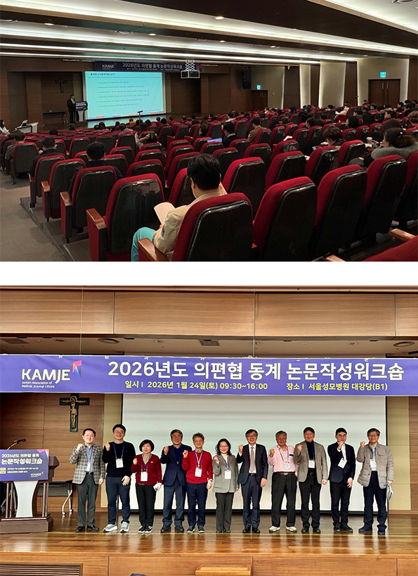 <프로그램 일정> 대한의학학술지편집인협의회(의편협)는 2026년 1월 24일(토) 09:30~16:00, 서울성모병원 대강당에서 논문작성 워크숍을 개최했으며, 편집인과 연구자 148명이 참석해 성황리에 마무리했다. 이번 워크숍은 AI 시대 의학학술지의 미래와 역할을 조망하고, 의학논문 작성 및 심사에서 필요한 최신 동향을 공유하는 자리로 마련됐다. 프로그램은 기조 강연을 시작으로 △의학논문 작성 트렌드, △AI/ML 연구 결과 보고 원칙, △AI/ML 분석 결과의 평가와 타당성 검증 등으로 구성됐으며, 참석자들은 변화하는 연구·출판 환경 속에서 AI 활용과 연구윤리·출판 기준의 균형, 신뢰도 높은 논문 작성과 검토를 위한 핵심 원칙을 함께 점검했다. 의편협은 앞으로도 국내 의학학술 출판의 질 향상을 위해 관련 교육과 워크숍을 지속적으로 운영할 계획이다.