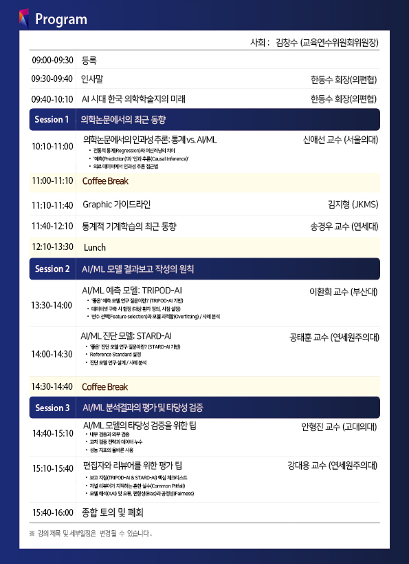 이번 워크숍은 AI 시대 의학학술지의 미래와 역할을 조망하고, 의학논문 작성 및 심사에서 필요한 최신 동향을 공유하는 자리로 마련됐다. 프로그램은 기조 강연을 시작으로 △의학논문 작성 트렌드, △AI/ML 연구 결과 보고 원칙, △AI/ML 분석 결과의 평가와 타당성 검증 등으로 구성됐으며, 참석자들은 변화하는 연구·출판 환경 속에서 AI 활용과 연구윤리·출판 기준의 균형, 신뢰도 높은 논문 작성과 검토를 위한 핵심 원칙을 함께 점검했다.